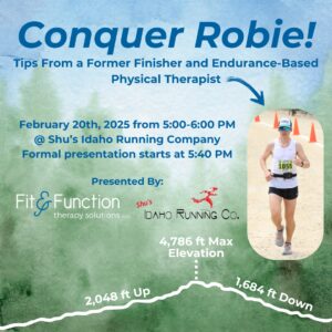 Join us for an exciting Conquer Robie clinic hosted by Fit & Function Therapy Solutions and Shu’s Idaho Running Company. Whether you are a seasoned Robie runner or looking to run for your first time, this event is perfect for you. Our expert Therapists will cover topics to get you to the start line healthy.