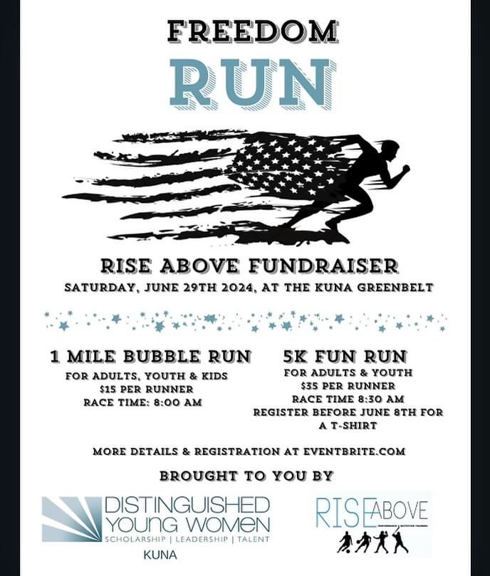 Organized by Lexi Peterson, the Distinguished Young Women of Kuna 2025, this 5k is meant to help you celebrate the 4th of July and fundraise for Rise Above. Rise Above is a charity organization partnered with Freedom Fitness that encourages youth to be physically active. Whether you’re a seasoned runner or just starting, this 5k is a fantastic way to enjoy the outdoors, exercise, be your best self, and support a good cause. We hope to see you there!