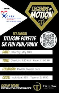 Join us for the First Annual TitleOne Legends in Motion 5K Charity run! All proceeds go to CASA!