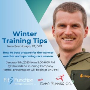 Join us to learn winter training tips from Ben Hoskyn, PT, DPT and employee here at Shu’s. Learn how to best prepare for warmer weather and the upcoming race season. Ben will do a formal talk at 5:40 but if you can’t make it and have questions feel free to come by at 5 or anytime after.